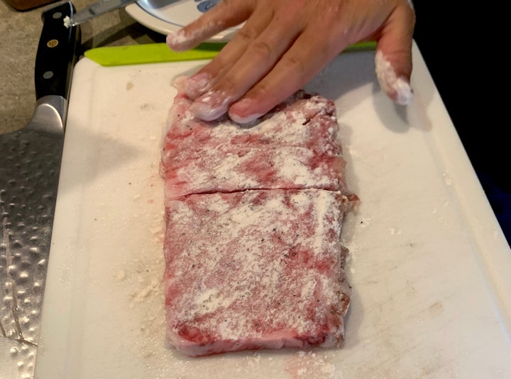 6. Season both sides of cutlet with salt and pepper, then lightly sprinkle with flour — patting evenly onto surface and edges so that all sides are covered.
